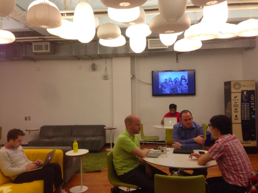 打开电梯门,身手敏捷的Eric Chambers热情的欢迎我们,之前我们打好了招呼。Eric是在AlleyNYC当中工作的一家公司Lean Startup Machine的其中一员。在门厅摆放着众多合作伙伴的标志,而这些标志的另一端,则是工作之余轻松休闲的人们,在咖啡机旁边选用他们自己喜欢的咖啡。