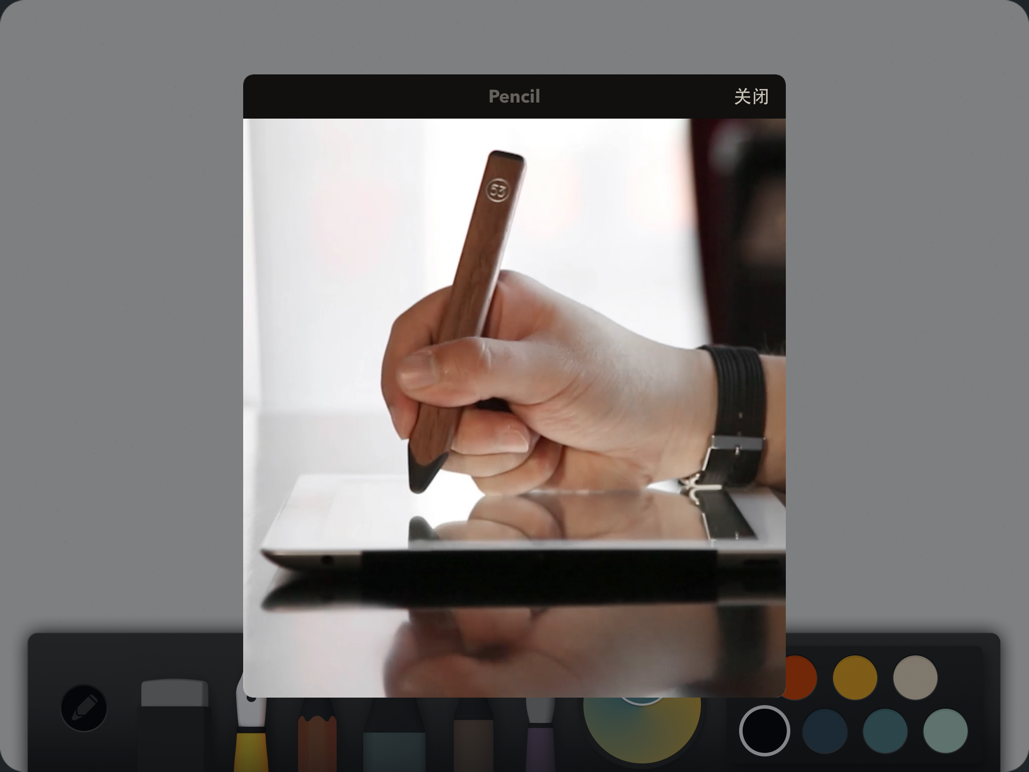 这支笔是没有开关的,放着不动一阵子就会自动休眠。使用的时候要打开iPad上的蓝牙功能,然后打开Paper里的画板,把调色板划出来之后,把Pencil的笔头放在标记的这个位置上,一直点按,看到有白色的光环正在加速,然后等到图标点亮的时候就可以使用了。
