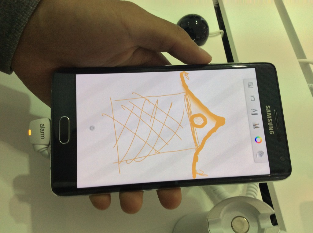 场馆内还有右边屏幕是曲面的 Galaxy Note Edge 的演示,这个机型会在20多号开始发售。举办活动的地点和上次豌豆荚活动的举办地完全一样。