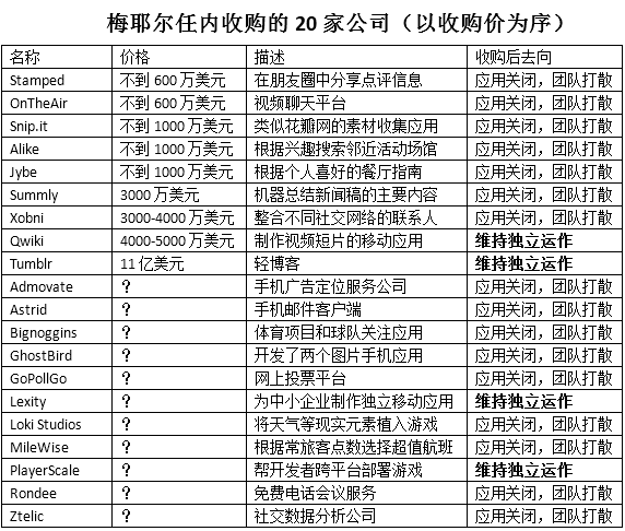 雅虎近期收购的团队和技术,最后很少有带着原品牌继续存活的。我们来看下面这个有趣的表格: