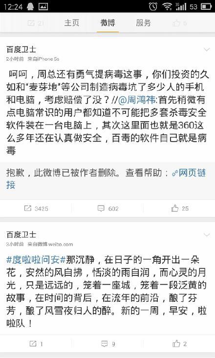 呵呵,周总还有勇气提病毒这事,你们投资的久如和“麦芽地”等公司制造病毒坑了多少人的手机和电脑,考虑赔偿了没?