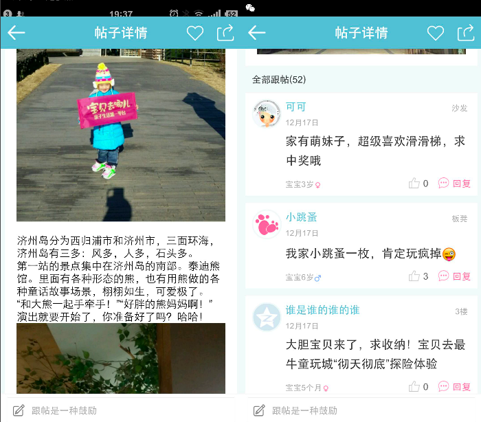 以体验记,游记为主的分享内容,单独占据了“宝贝去哪儿”应用的一个栏目。优质的用户生成内容被单独展示出来,其他家长用户可以在下面评论。我可以非常明确地通过这些文章本身看到家长的热情,这是“段子手”写出来的东西所无法比拟的。家长们会在他们自己写的文章中,不自觉的用上“感谢宝贝去哪儿给我提供了这样的机会”,而“家有萌妹子”,“我家小跳蚤”这样的称呼背后,都是一个个活生生的孩子,似乎在向你招手一般。