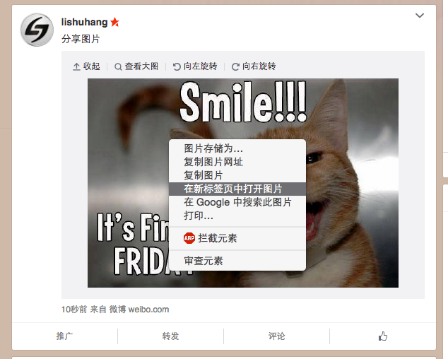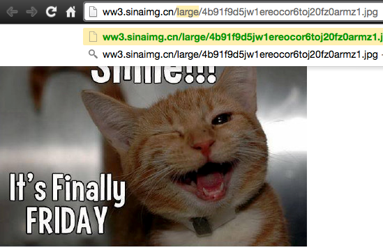 9.2、将中等大小的图片在新窗口打开,将网址当中的 bmiddle 改为 large,就可以快速获得原来尺寸的图片。