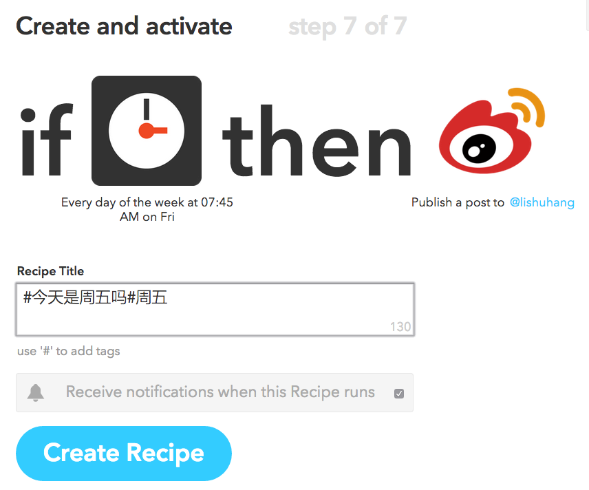 10、给刚做的触发条件起个名字,点“Create Recipe”就好啦。