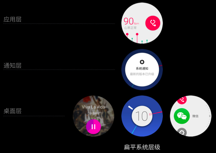 tos的操作逻辑尽量简化,分成3个层面。桌面在最底下,应用程序在最上面,中间夹着各种通知。从应用退出后会先看到其他通知,然后才回到桌面。