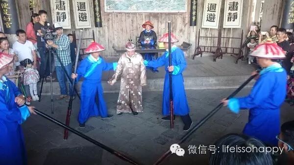 我们到的时候正赶上县衙上演当天最后一场演出,所谓演出,就是工作人员穿上戏服,上演一出县官升堂判案的表演。说是3:30开始,我们到售票处已经3:20了。从入口处急忙奔赴县衙最热闹的地方,用了10分钟走路走到,结果又多等了10分钟再开演。