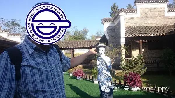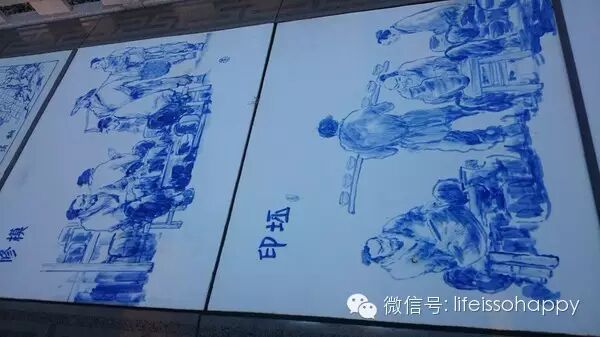 而城墙之外,还有最后一个景观给你欣赏。这就是纵贯城门前广场,正对大门,延伸开去的一个铺设在地面的瓷砖画廊,讲述了从汉唐到1960年代,浮梁地区的历史沿革。我们是从画廊末尾一步步往回退的,为了看清楚只能倒着走路。