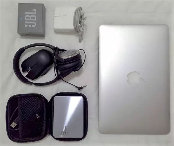 夹层1:Macbook Air 11 + 充电器、西数 My Passport Ultra 移动硬盘 2T 银色版、Bose QC3 耳机※、JBL Go 小音箱、Razor Orochi 鼠标※