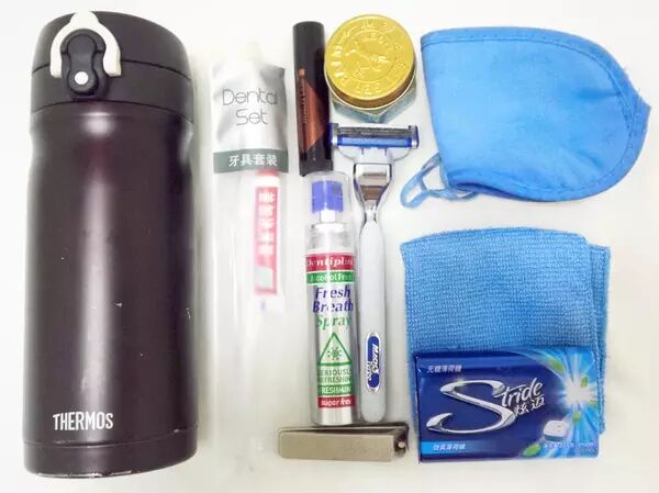 外侧上袋:膳魔师 JMY-350 杯子,(从酒店顺来的)旅行牙具、吉列锋速 3 突破剃须刀、DentiPlus 口腔护理喷剂或者口香糖、曼秀雷敦男士唇膏、MUJI 小号指甲刀、虎标万金油(白)、眼镜布、眼罩