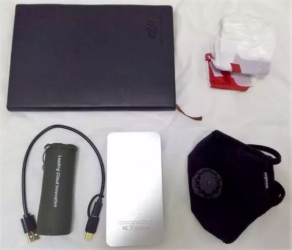 外侧下袋:移动电源、Micro-USB / USB-C / iPhone 多用连接线、软皮笔记本、一个折叠好的超市塑料袋、纸巾、Vogmask 口罩、用电池的小手电筒
