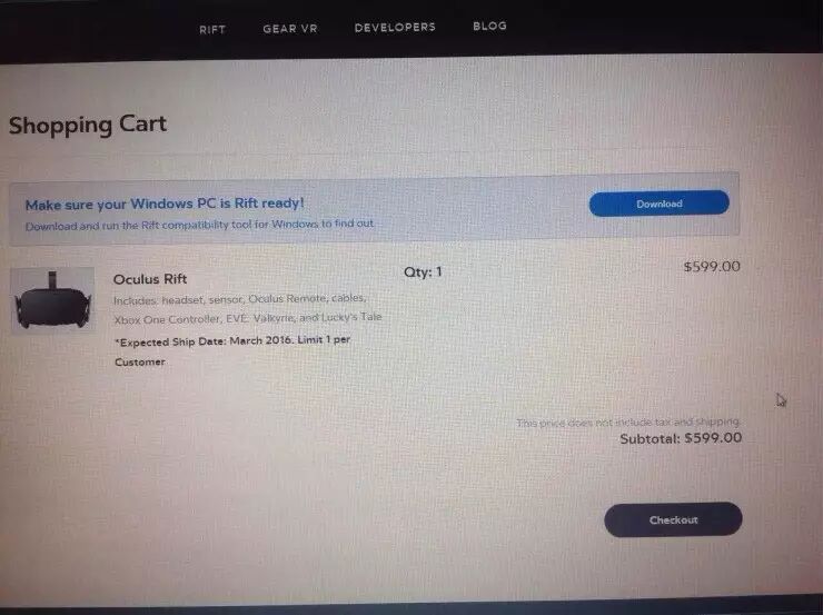 1月5日,Oculus通过官方博客表示,消费者版Rift头盔的预订将于太平洋时间1月6日早上8点(北京时间1月7日凌晨0点)开启。就在刚刚,消费版Oculus Rift头盔正式开启预订,通过官网显示,我们可以看到其售价为599美元(折合人民币3930元,不包括税费和运费)。而且,每人只能购买一台。