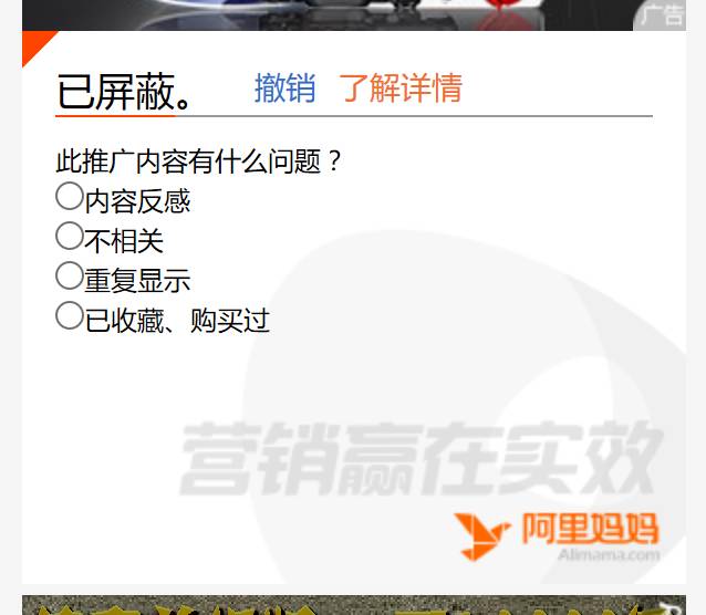 在阿里广告右下角“推广”字样处,鼠标指向后变成“屏蔽”,点击并选择适合的选项。