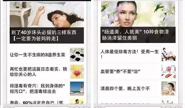 - 养生类——这类文章话题永远离不开人身安全、食品安全和疾病养生这几类。文章总是有着耸人听闻的标题,有些还要配上不忍直视的,带有色情嫌疑的诱导图片;正文看似充满道理,实际上却专业性不强,甚至很多都是传了无数遍,也被辟谣删帖无数次,却依然无法根除的谣言。