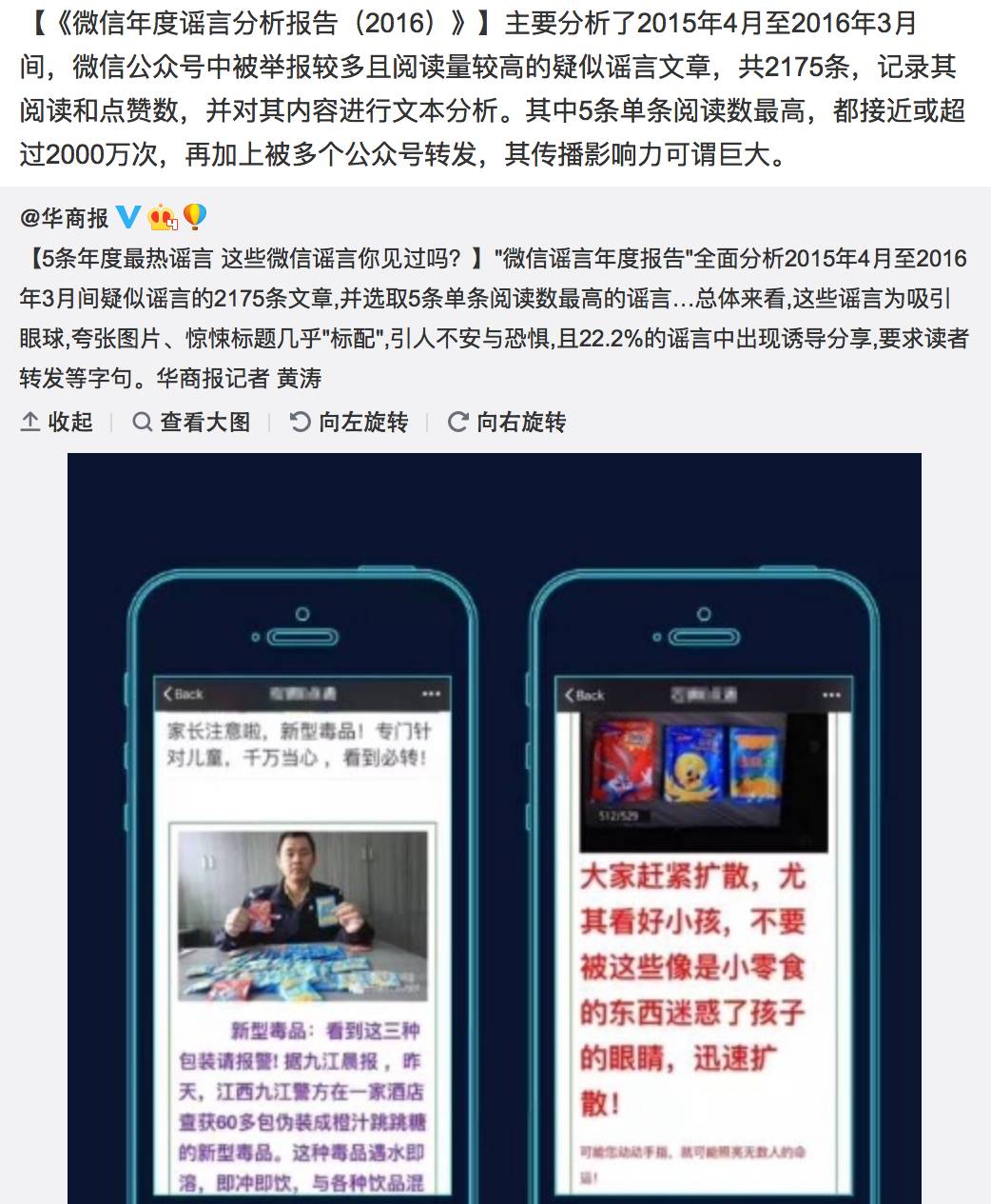 《微信年度谣言分析报告》指出,谣言都喜欢用“100%”、“第一”等夸大性词语,“毁容”、“有毒”、“致癌””等负面词语,并配大量图片。然而同时,它们的消息源往往都不够专业,且材料与主题有时毫无关联。