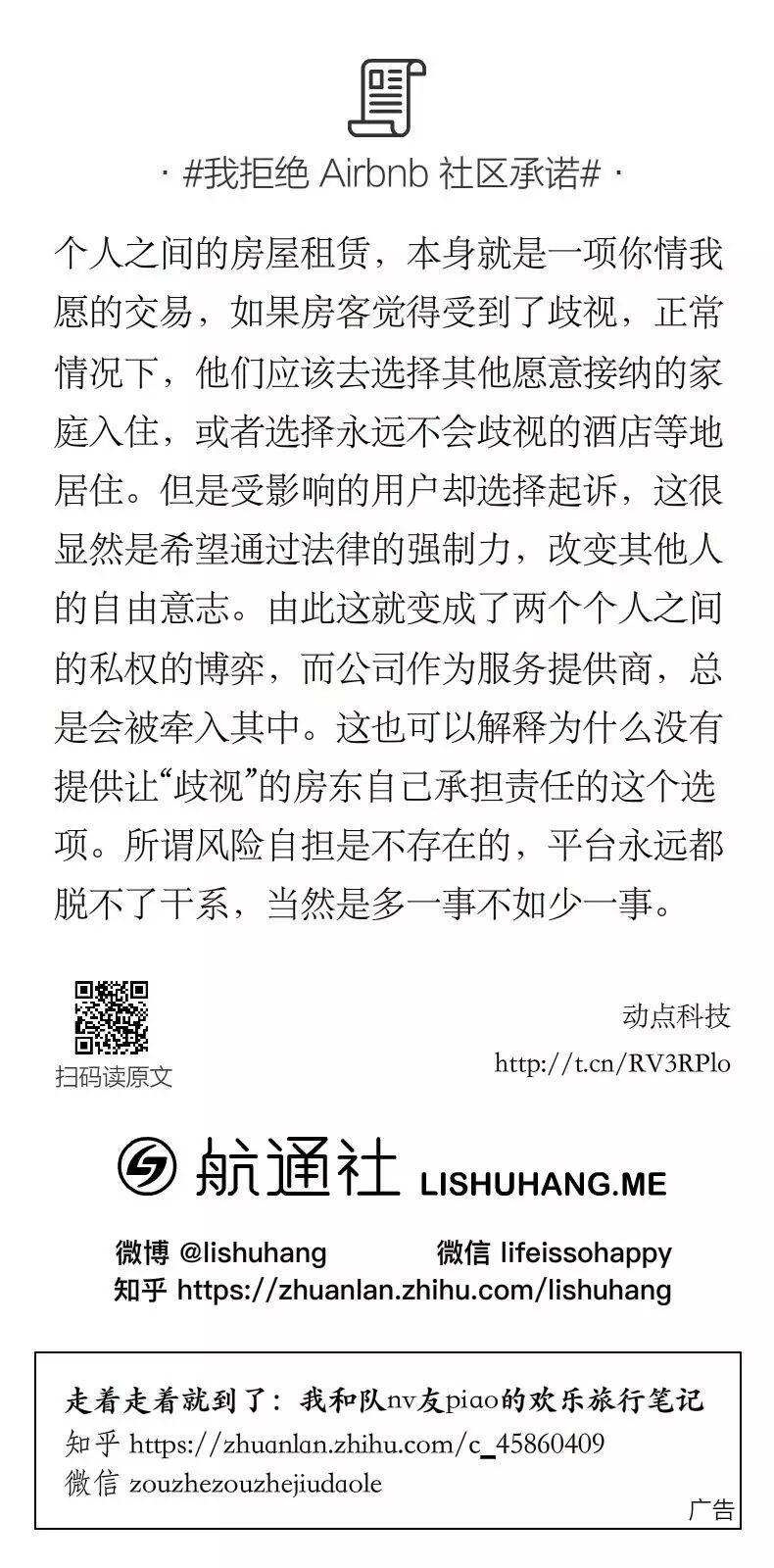 之所以 Airbnb 要这样做其实很容易想到原因。在过去一年当中 Airbnb“发起了关于平等权利的行动”,实际上是有房客入住时感觉被房东“歧视”,因此对 Airbnb 公司提起了诉讼。个人之间的房屋租赁,本身就是一项你情我愿的交易,如果房客觉得自己受到了歧视,正常情况下,他们应该去选择其他愿意接纳的家庭入住,或者选择永远不会歧视的酒店等地居住。但是受影响的用户却选择起诉,这很显然是希望通过法律的强制力,改变其他人的自由意志。由此这就变成了两个个人之间的私权的博弈,而公司作为服务提供商,总是会被牵入其中。这也可以解释为什么在所谓《承诺》当中,没有提供让“歧视”的房东自己承担责任的这个选项。因为所谓风险自担是不存在的,平台永远都脱不了干系,当然是多一事不如少一事。