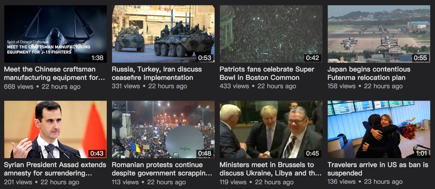 但是,日常发出的新闻转发量就少多了,发布1-3天后,平均点击都维持在100-300次之间。当然你不能说人家不努力——每天都会有30多段新闻片段上传。对比CNN、半岛的AJ+和RT的YouTube频道,日常传送新闻发布1-3天后平均点击都在1000-3000次之间。