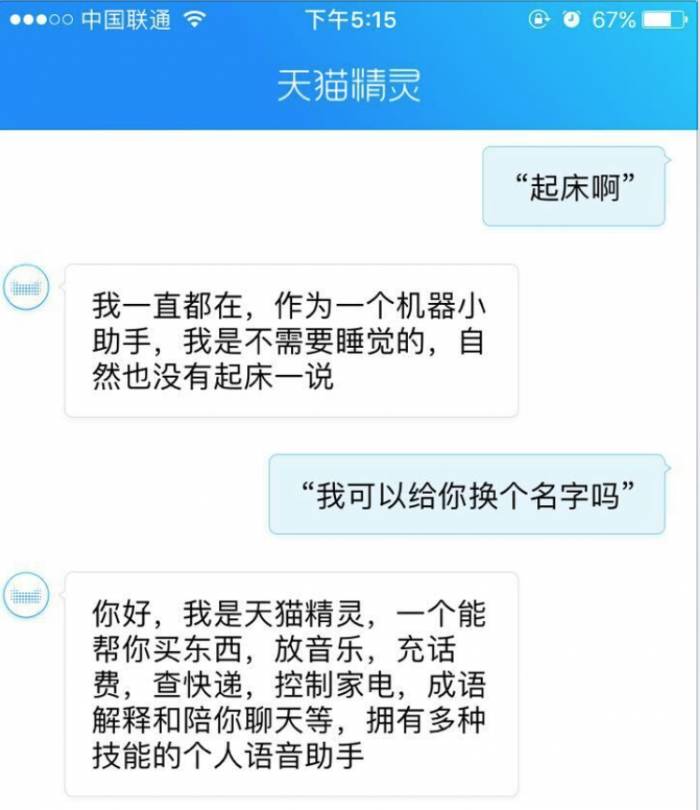 - 唤醒词“天猫精灵”(第一次配置时说“你好天猫”)不够友好,因为每次说一句话都必须念唤醒词,还不能太含糊,这跟无缝与人交互的感觉就很不协调了。相比之下“Alexa”和“若琪”都在默认唤醒词上做了一定的功夫;而最佳策略绝对是自定义唤醒词,我就知道有人把Echo音箱命名为“傻”然后每天欢快的喊“嘿,傻,给我开窗帘”这样。
