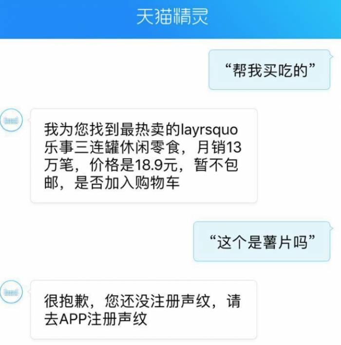 - 在线购物有很多问题。首先是推荐,因为不支持上下文,很难在说出商品名后,紧接着再让它继续推荐下面的,就等于它只能推荐搜索结果页上第一个结果。很显然,这对其他的商品和我们继续采购的意愿不公平。其次,设置声纹之后,它依然不能顺畅支付,我们的每一次尝试都只是成功加入购物车,而没有前进到支付环节。