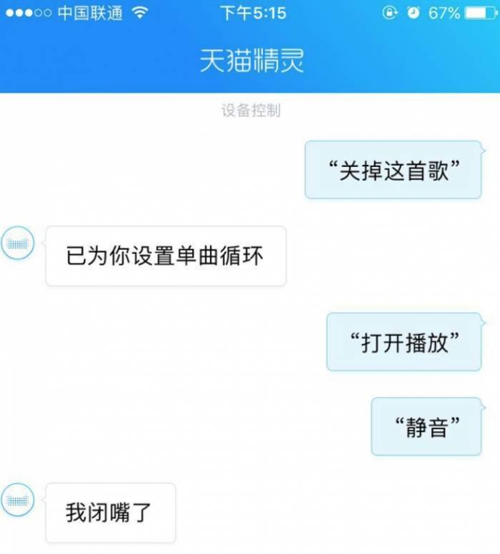 - 很多它不理解或没听懂的内容,都默认去找了它理解的跟关键字近似的歌曲。而让它闭嘴是个技术活……说句自然点的“关掉这首歌”,它返回“为你开通了单曲循环”。最后只好“静音”,回答“好的,我闭嘴了。”