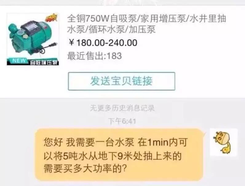 甚至,居然还有人用淘宝做物理题——方法是找一个卖水泵的,对他询问:“您好,我需要一台水泵,在一分钟内可以将 5 吨水从地下 9 米处抽上来需要买多大功率的?”——卖家的答案是 100KW。(来自微博用户 @奸胸)