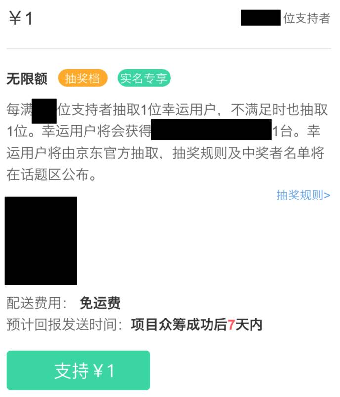 此类项目一般将金额设置为1元,抽奖用户数量正好满足售出1台机器的众筹价格时就会开奖一次,余数不满足时也会把剩下的人再集合起来开奖一次。京东众筹的不少项目都有这样的抽奖档位。