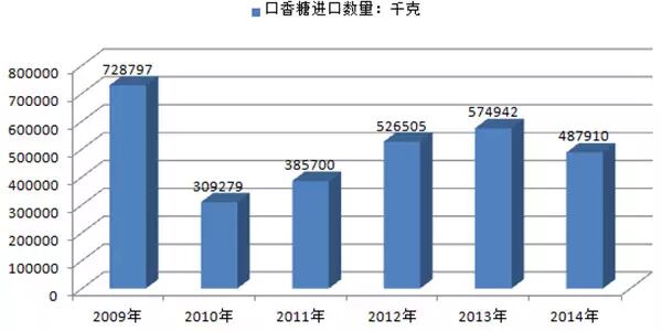 在国外品牌为主的前提下,一份报告显示 [3] ,中国的口香糖进口数量(不论是否裹糖)在 2009 年达到 728,797 千克的高位后,翌年腰斩到 309,279 千克。此后虽有波动,但始终没有回到原来的水平,2014 年是 487,910 千克。