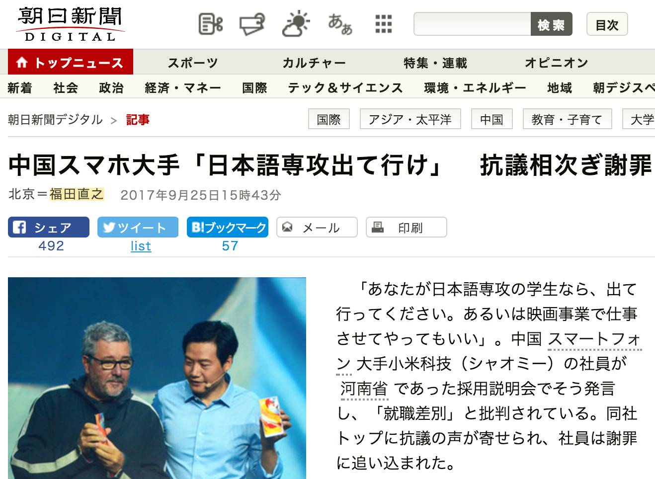 《朝日新闻》驻北京记者福田直之以《中国智能手机大牌称“日语专业的学生可以走”,引发抗议并为此道歉》 [1] 为标题报道此事,该文在今天下午一度登上日本雅虎、Excite、Livedoor 等媒体首页,晚间才被安倍宣布解散议会提前大选的消息替代。