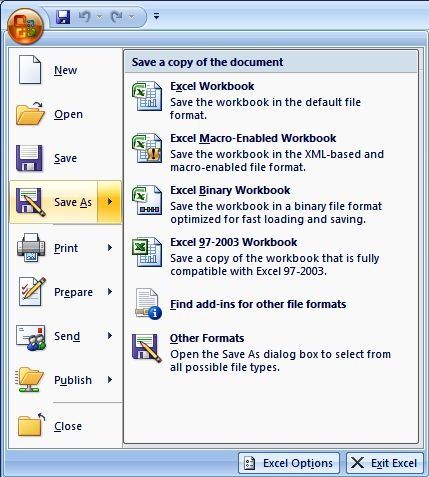 Ribbon 的灵魂是在整个界面左上角的“文件”菜单,在 Office 2007 当中是一个圆形的 Office 图标按键。这个按钮多少借鉴了 Windows 的“开始”菜单。