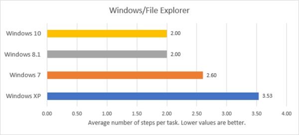结果显示,在写字板、画图、资源管理器等界面中,使用旧式界面的 Windows XP 平均需要鼠标移动 3.5 步来完成一个操作,在含有 Ribbon 的 Windows 7/8/10 当中只需要 2-2.5 步。