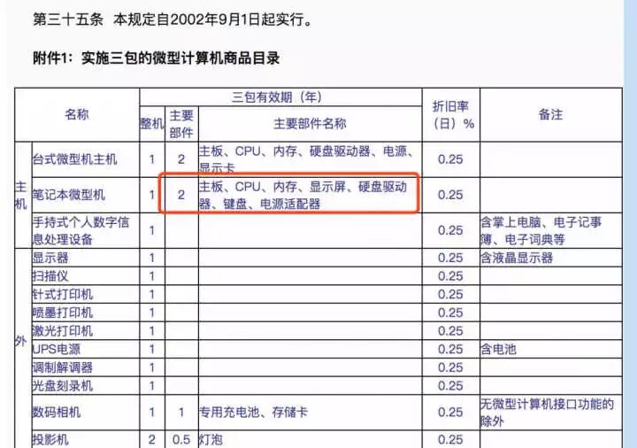 2002年9月1日起实行的《微型计算机商品修理更换退货责任规定》[1] ,其中附件1《实施三包的微型计算机商品目录》,在“笔记本微型机”当中,包含“主板、CPU、内存、显示屏、硬盘驱动器、键盘、电源适配器“。