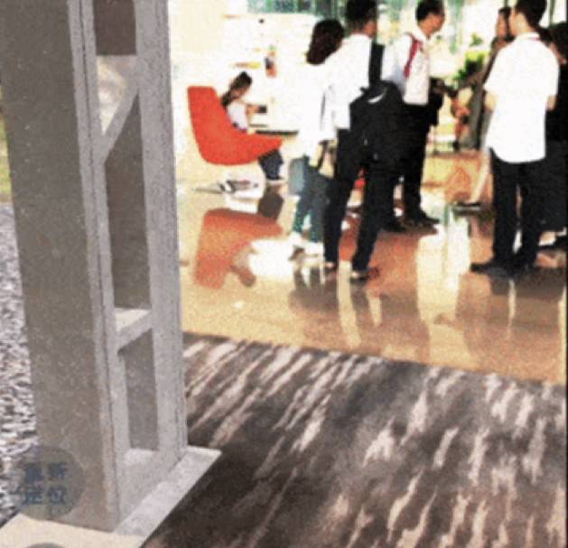 左侧“柱子”是虚拟展厅入口,下方地毯和右侧人群是真实场景