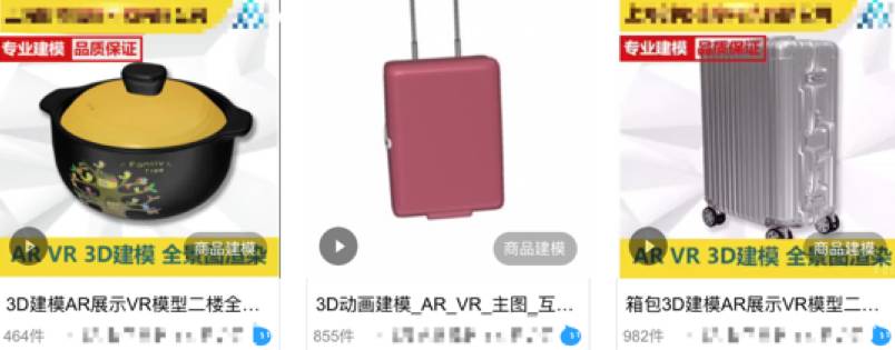 百度和阿里的AR案例都使用了纯3D建模的方式,这就要求开发者必须建立3D模型。在阿里服务卖家的“内容市场”当中,制作AR模型和交互已经成为产业。几家店铺的建模和服务费用大概在六七百到2000多块钱不等,视模型复杂度和交互难易度而定。
