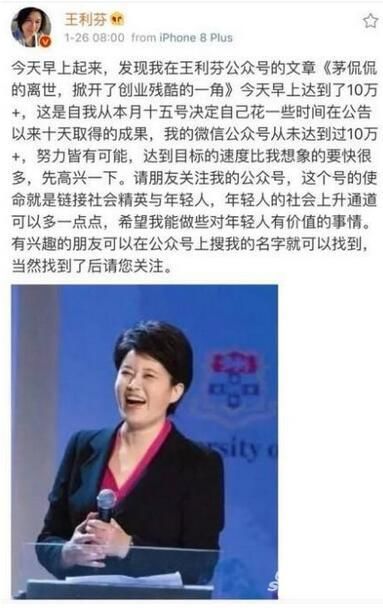 就在此时,优米网的王利芬 发了一条颇为自得的微博 [3] ,说自己就茅侃侃写了一篇微信推送,现在已经 10 万+了,她刚开始运营微信号就获得如此成绩很高兴,希望大家继续关注。