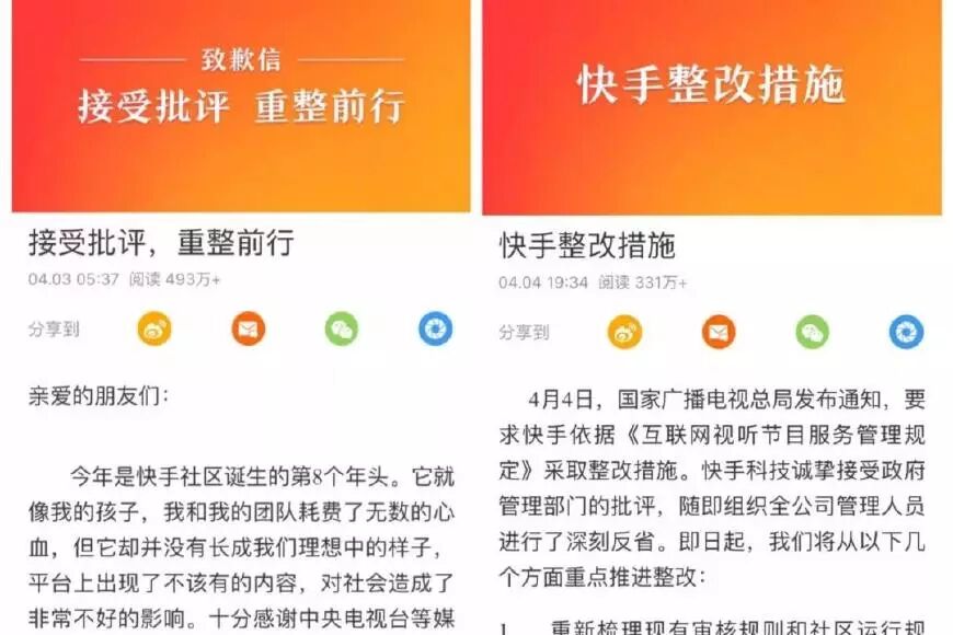 打开界面,顶端一个通栏横幅,红底金字的整改措施,既像罪人如泣如诉的忏悔,又显出改过自新的强烈欲望。快手在横幅上没啥空间可以施展,只好选了一个稚拙的字体,像是歪着脑袋听老师训斥的孩子。