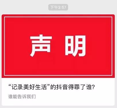 今天下午,今日头条的官方微信号推送了一篇文章,控诉不知从哪里冒出来的“黑公关”,对抖音搭上快手和火山的顺风车做批判的文章,其内心的委屈和辛酸力透纸背。