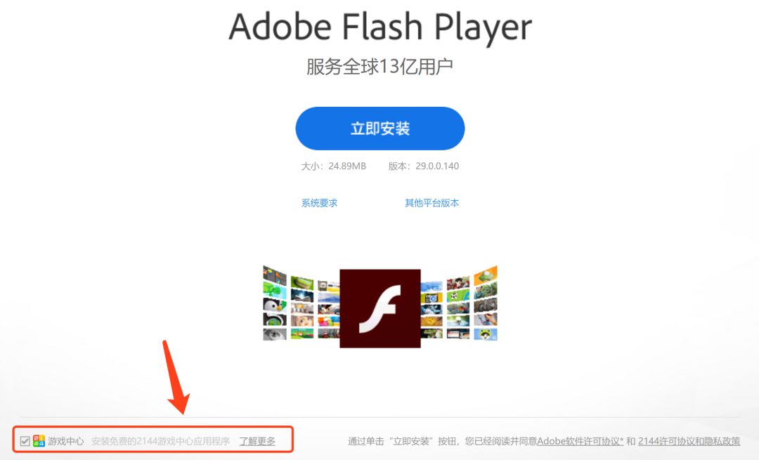 在距离 Flash Player (即 Flash 浏览器插件)彻底退役不到两年的时候,仍有需要单独安装 Flash Player 的中国用户发现了一个奇怪的现象:Windows 版官方安装程序,会默认捆绑安装名叫“2144 游戏中心”的软件 [1] 。