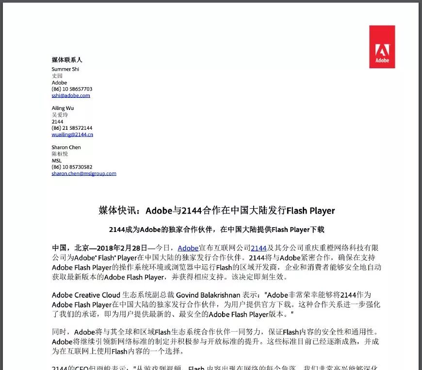 当然,人们的第一反应是自己被DNS劫持了,或者至少这个2144小游戏是假托官方名义。直到2018年2月28日,Adobe官网发布的新闻稿 [2] 证实“互联网公司2144及其分公司重庆重橙网络科技有限公司,为Adobe Flash Player在中国大陆的独家发行合作伙伴”,终结了所有的猜测。