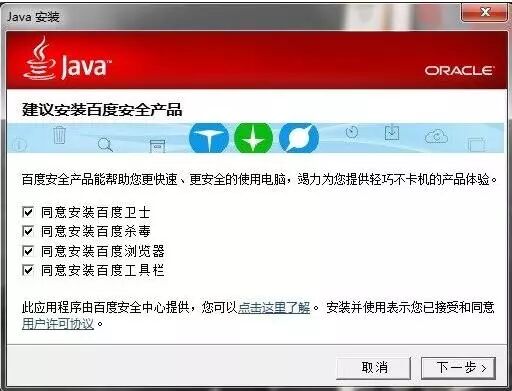 2015年1月25日开始,甲骨文和百度之间达成战略合作关系,向Java用户推荐安装百度安全产品。Java 8 Update 31版本会默认勾选安装百度卫士、百度浏览器、百度杀毒和百度工具栏 [7] 。