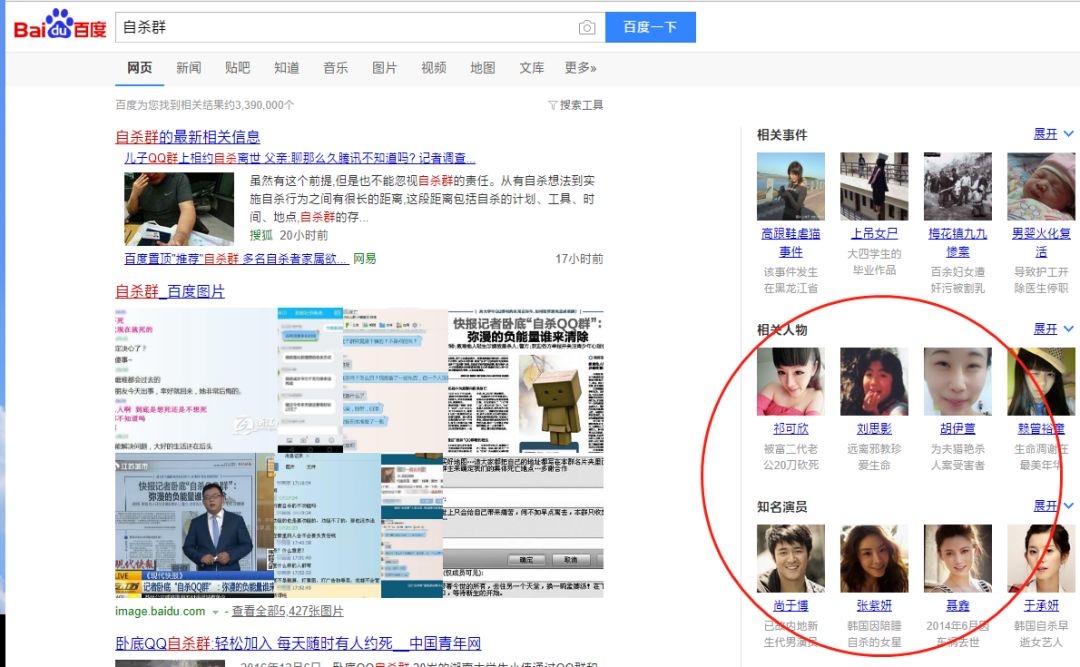 当“自杀群”关键词被系统认为是新闻热点的时候,在页面右侧的推荐结果当中,就会提示“相关人物”——最近有什么名人自杀了,以及其中包含的“知名演员”。