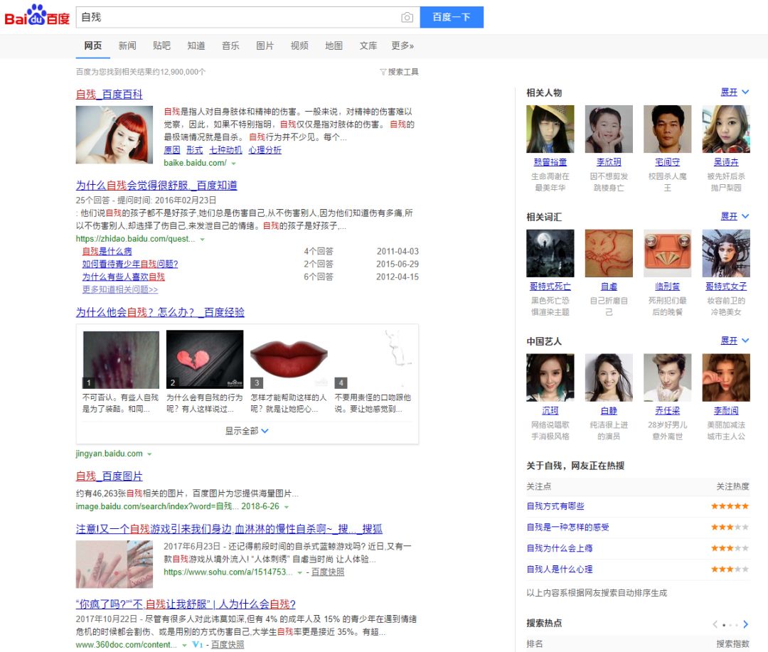 此外,也有网友指出,百度虽然对“自杀”实施了干预,但对造成后果同样很严重的“自残”却没有干预。
