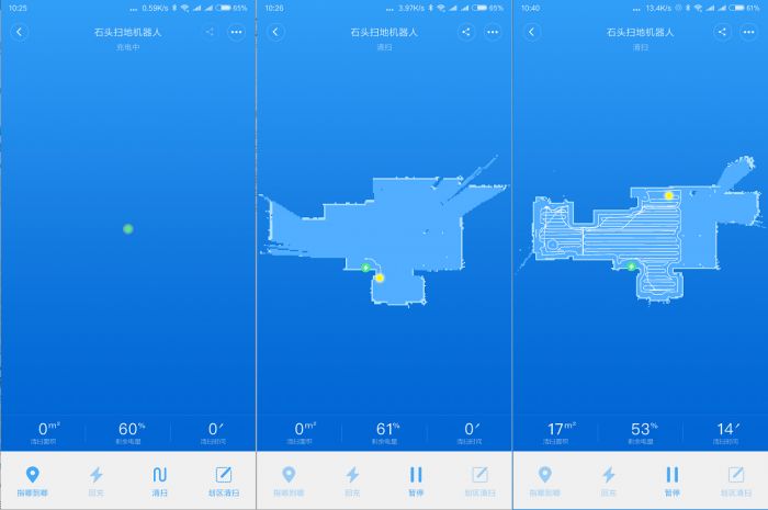 在我们启动清扫之后,我们可以发现石头扫地机器人的清扫过程,以及路径规划跟原先基本上是相同的。