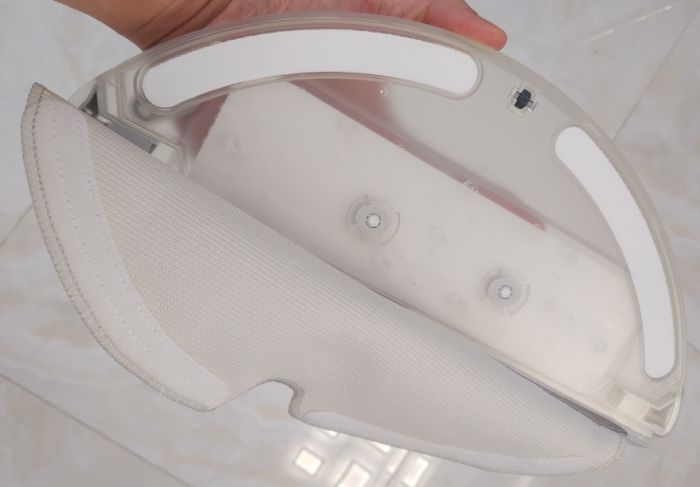 你只需要把它固定在机器人的前端,有一个卡扣,装好的时候会发出咔哒一声。按照说明,每隔半个小时需要更换一次水箱的水,同时如果滤芯变黄了也需要更换。至于拖布,拆下来之后正常清洗即可。