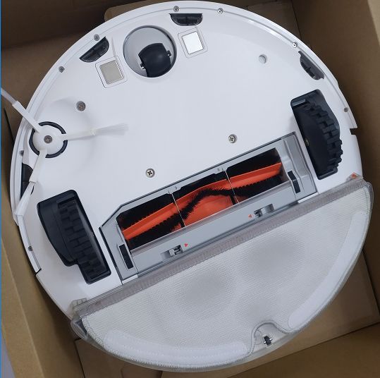 拖地组件包括一个薄薄的水箱,一个已经绑在上面的拖布,以及换洗的拖布,还有可以替换的滤芯。没错,拖地也是需要用滤芯的。这个装置本身是不带电或传动装置的,由机器在扫地的时候带动着他前进。