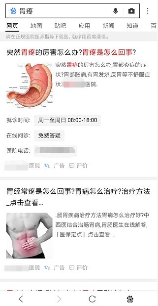 发稿之前,通过手机百度搜索“胃疼”的结果。图 / 航通社