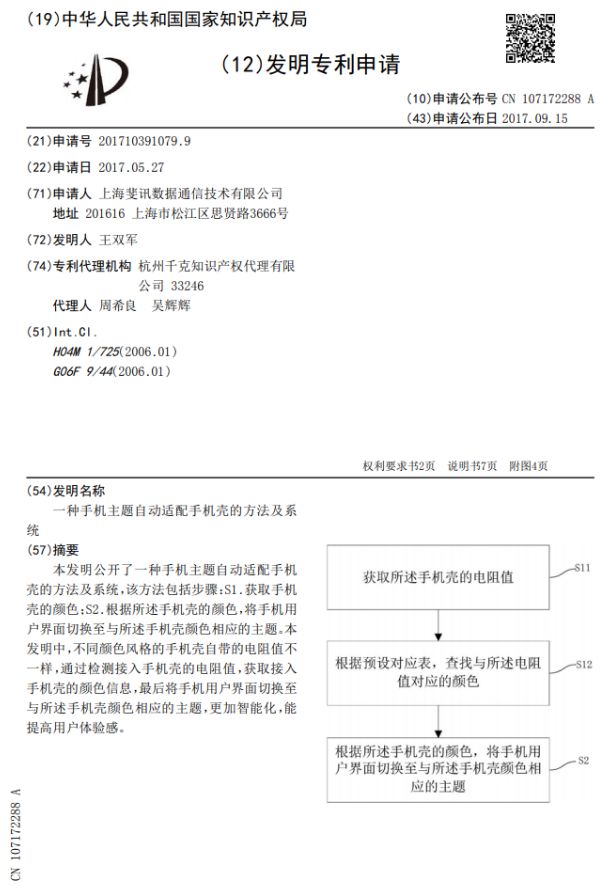 从国家专利局的检索网站上,航通社找到了一份由“上海斐讯数据通信技术有限公司”申请的发明专利,名称为《一种手机主题自动适配手机壳的方法及系统》。