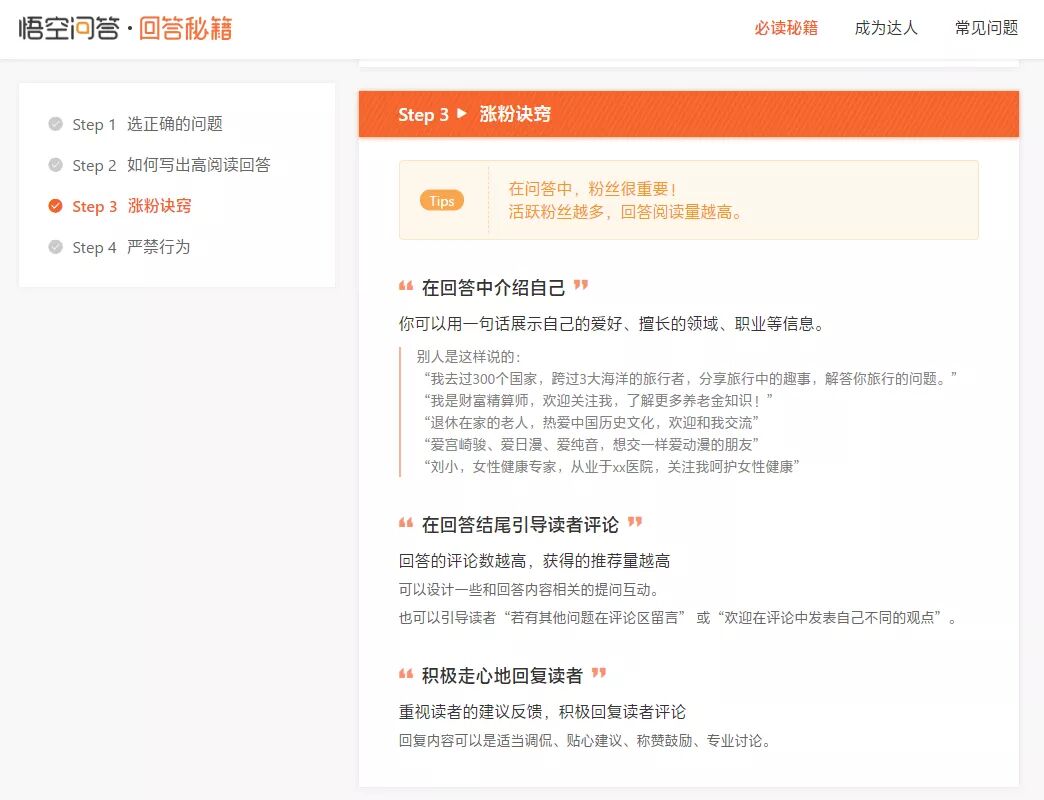 在界面右上角的显著位置是官方帮助文档,取名为“回答秘籍”,点开一看,介绍的是“如何写出高阅读回答”、“涨粉诀窍”、“不会获得阅读量的行为”。