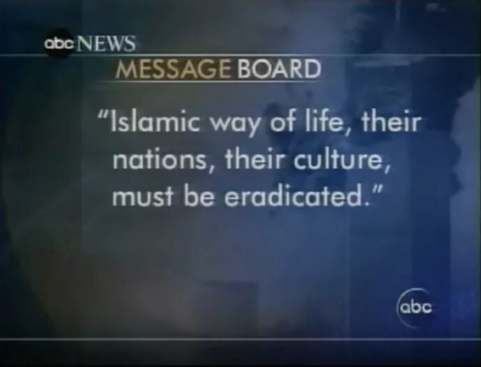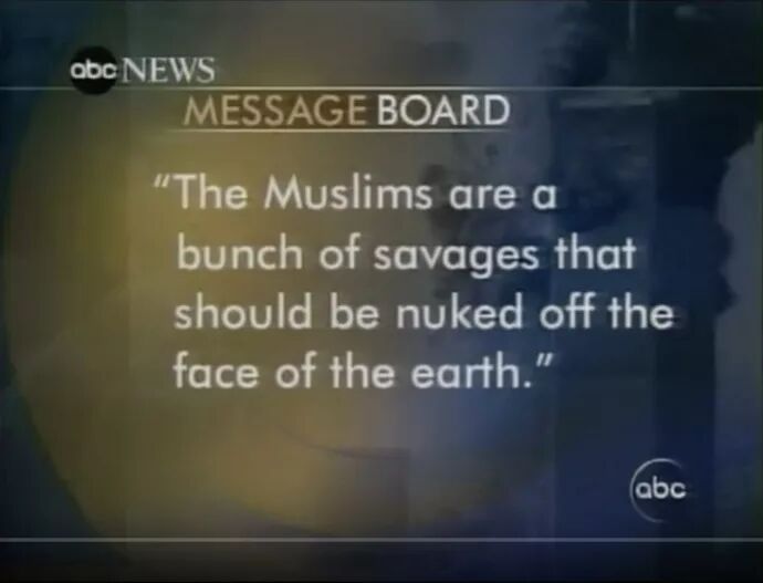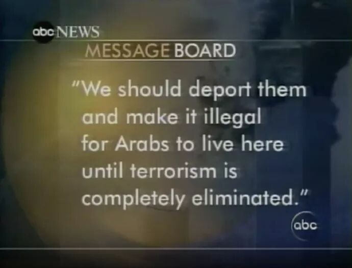 还有其它的条件反射。在2001年9月12日的《ABC今夜世界新闻》特别节目中,美国广播公司(ABC)官网的留言板有如下今天看起来也很熟悉的评论: