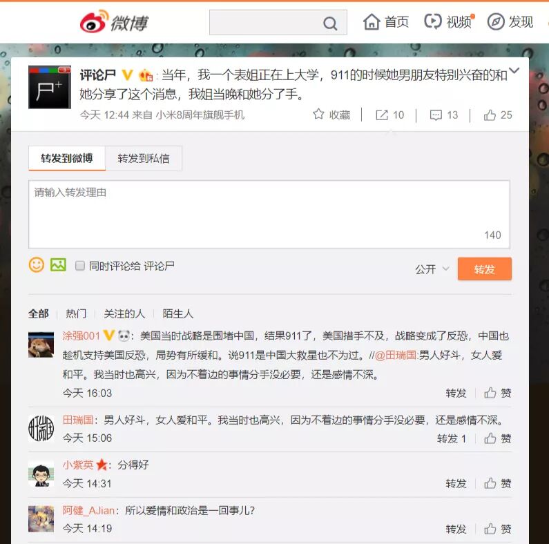 9/11事件因此成为一部分中国人与亲友之间的三观测试器。我的朋友评论尸说:“当年,我一个表姐正在上大学,911的时候她男朋友特别兴奋的和她分享了这个消息,我姐当晚和她分了手。”
