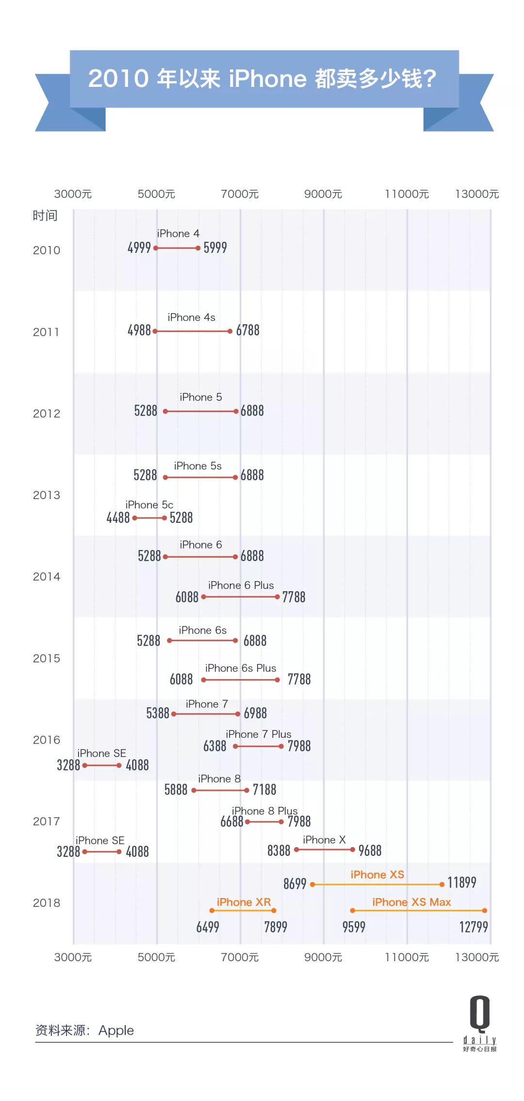 根据媒体总结,iPhone 定价按年水涨船高一直在进行中。2010 年的 iPhone 4,顶配售价也是只有 5999,如今 iPhone Xr 最低配置就超过了当年顶配的价钱,要卖到 6499。