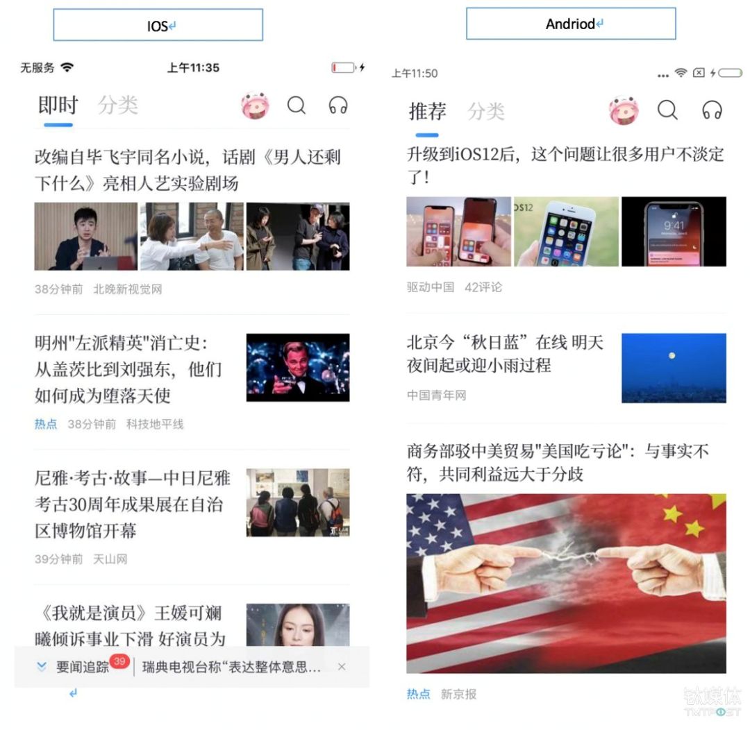 不过,最让人感兴趣的则是这一版产品独特的做法:在 iOS 和 Android 系统分别安装时,用户第一眼看到的信息流,会根据操作系统的不同而有所变化。